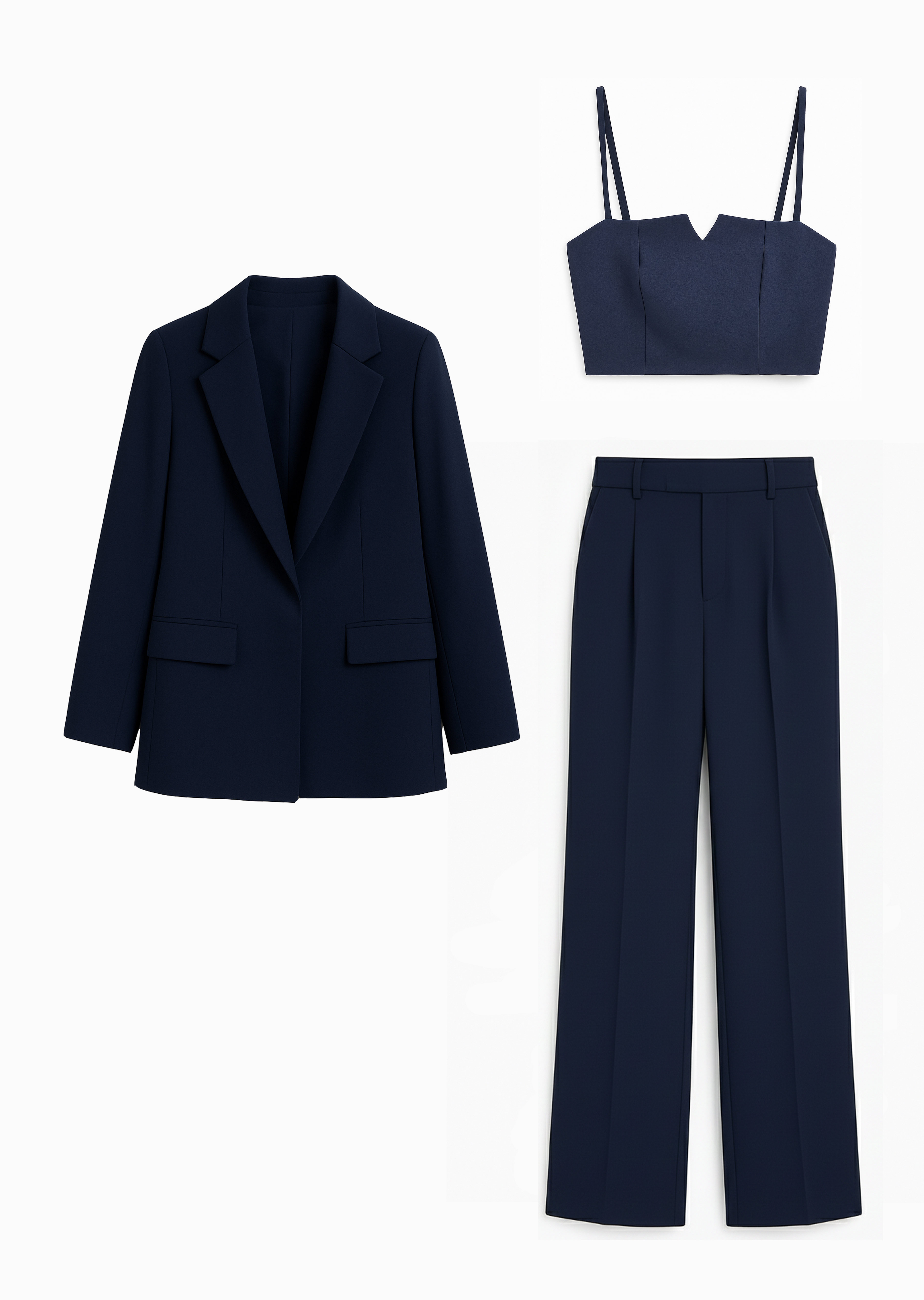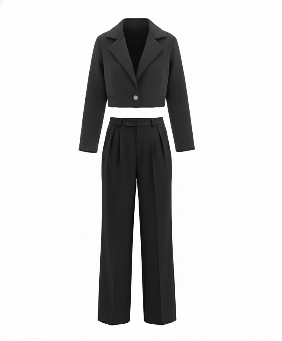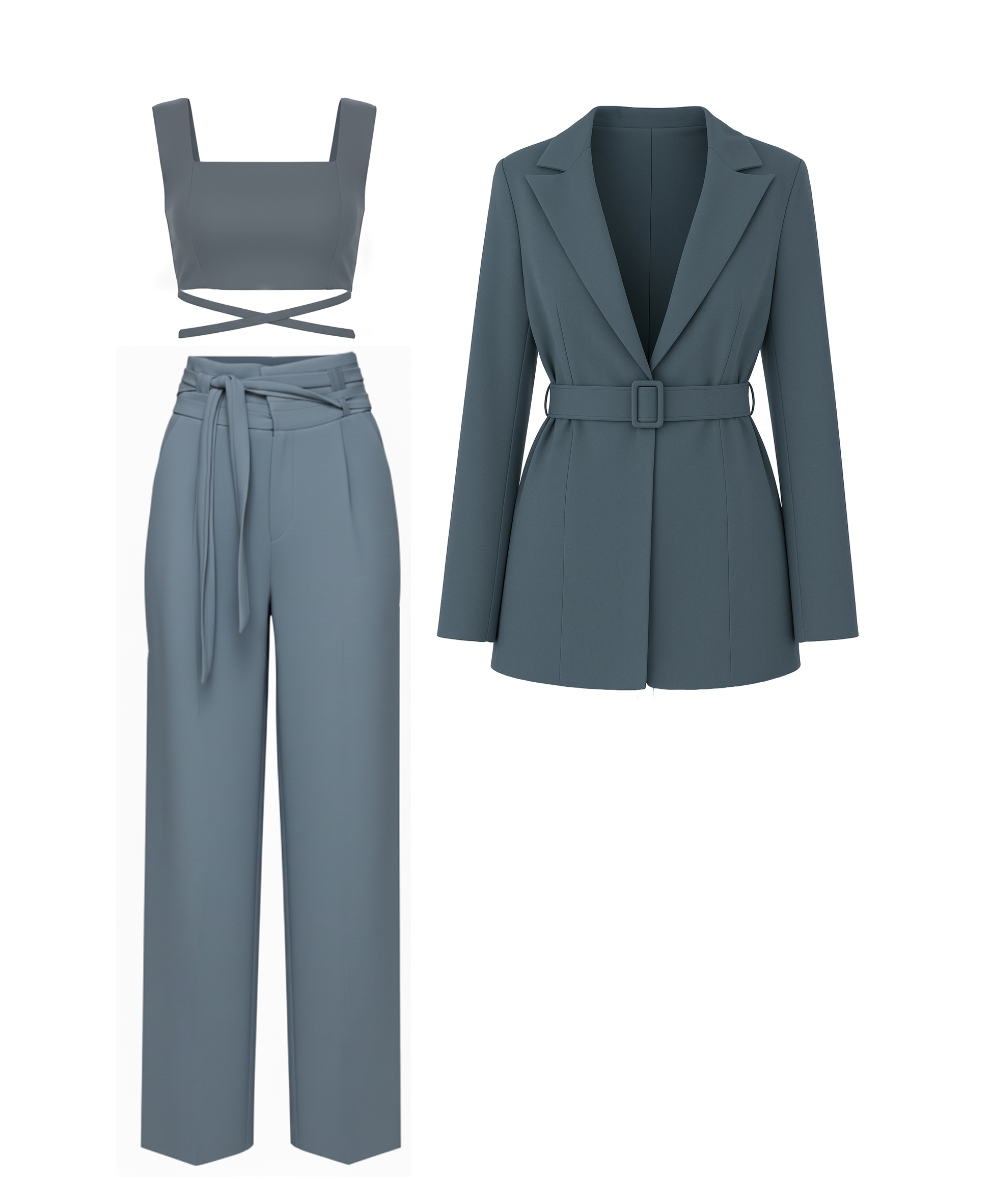 ست سهتکه کت و شلوار و کراپ تاپ فشن زیوا کاج رنگ طوسی و از جنس پارچه کرپ مازراتی