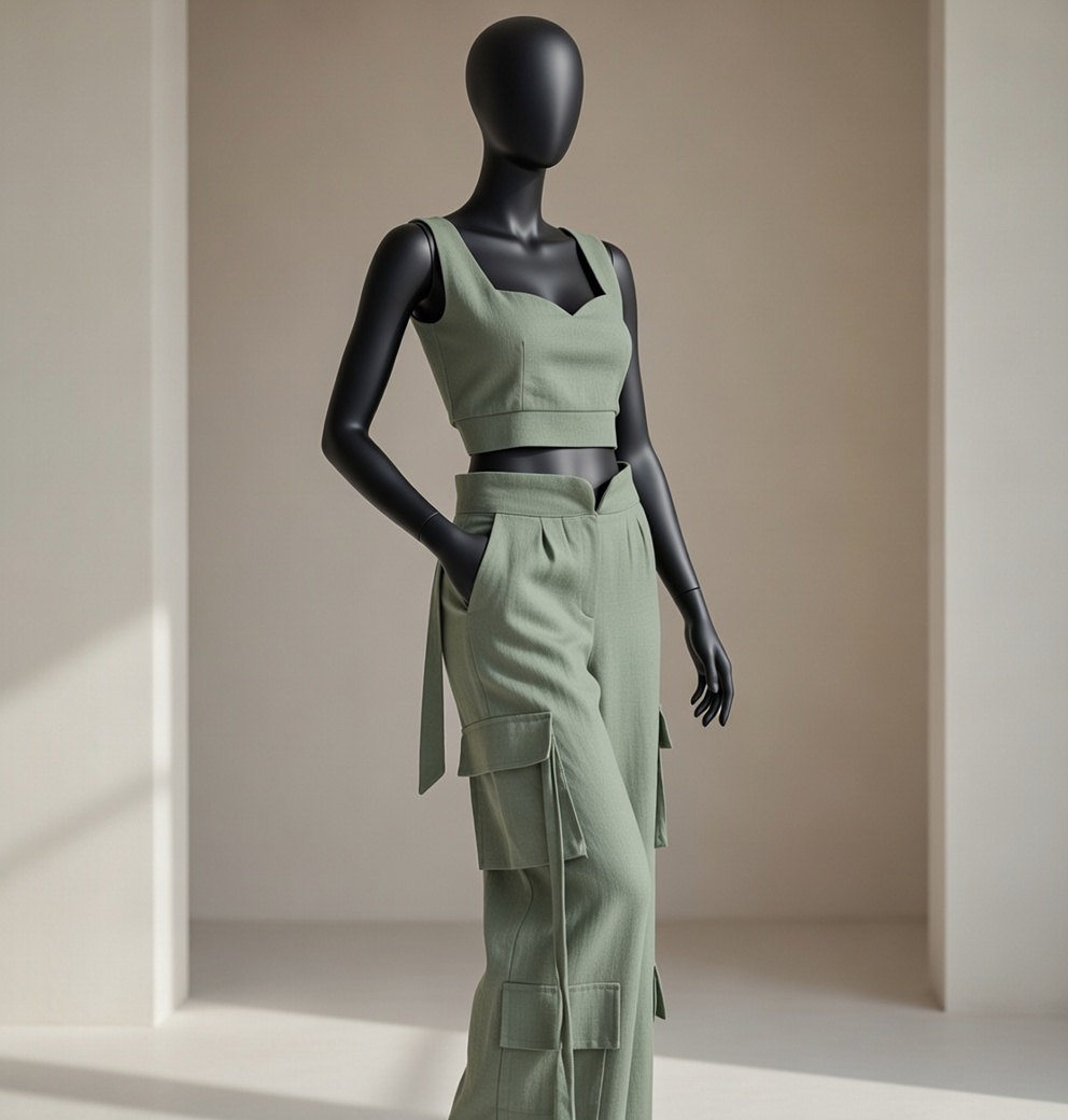 ست کراپ تاپ گرهای و شلوار کارگو کژوال شیلان کاج - جنس لینن