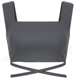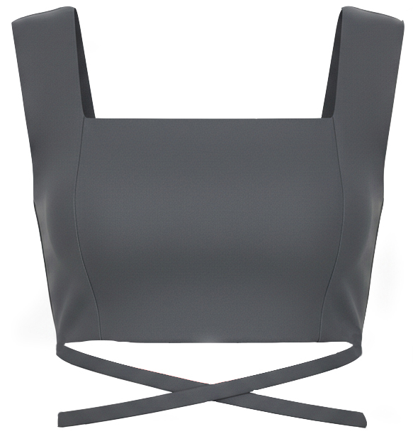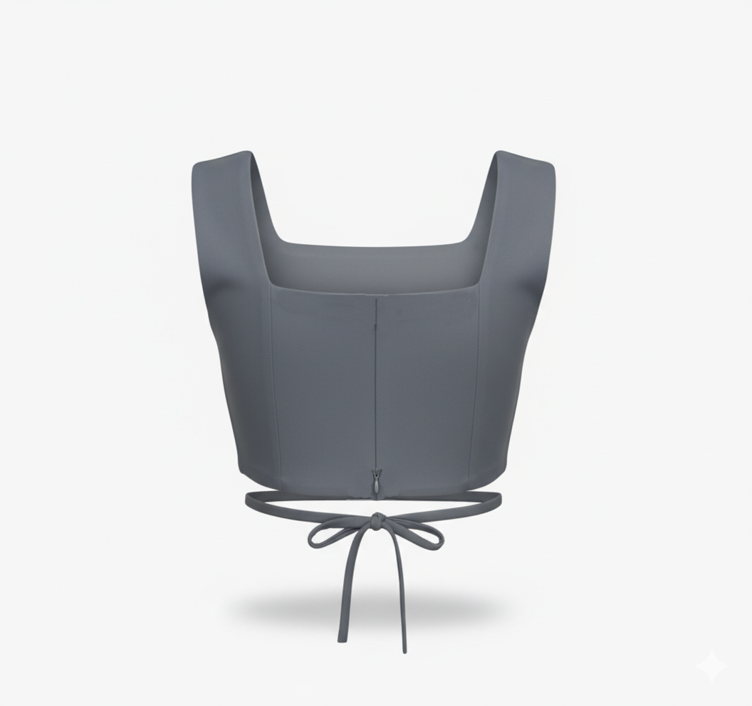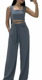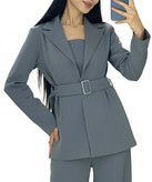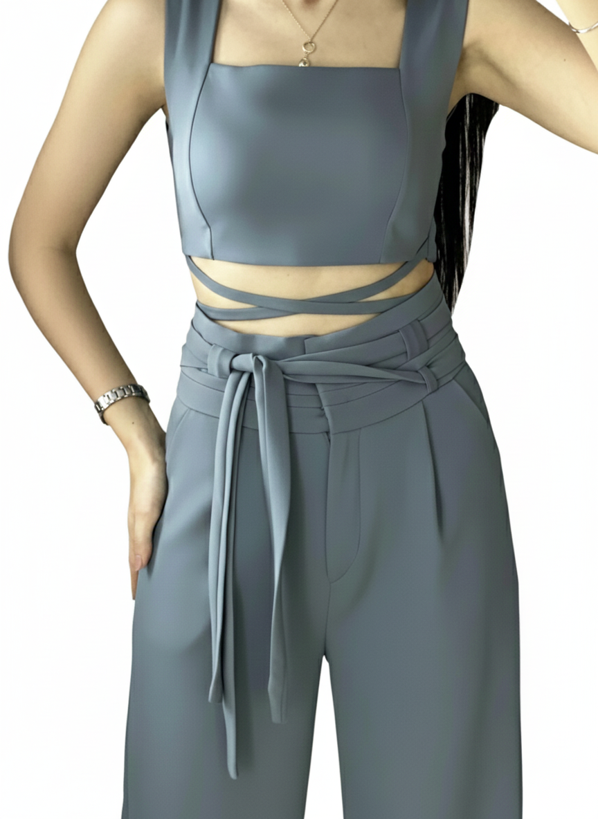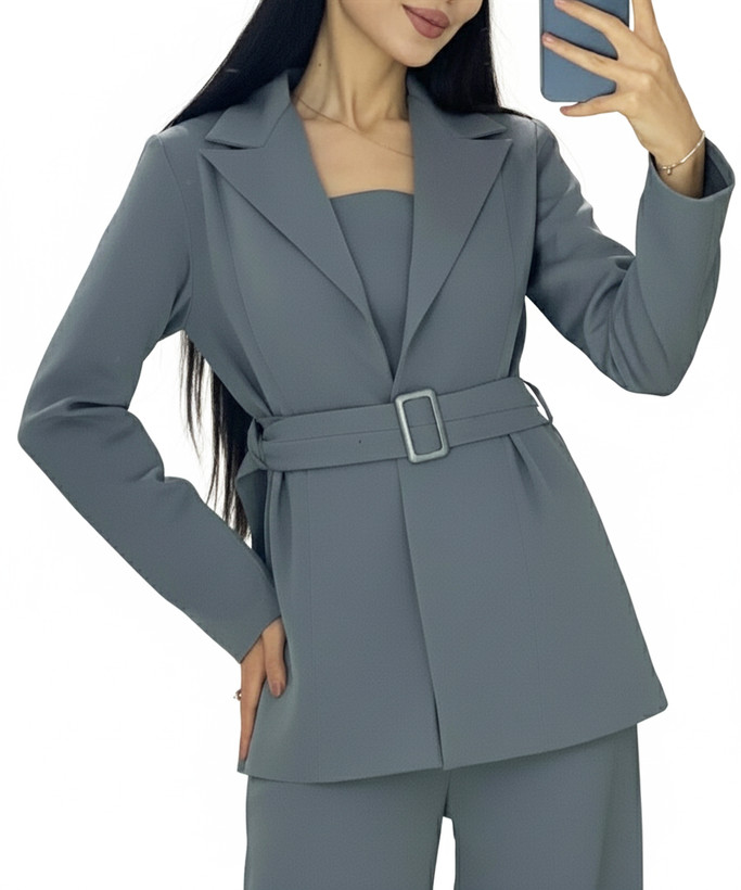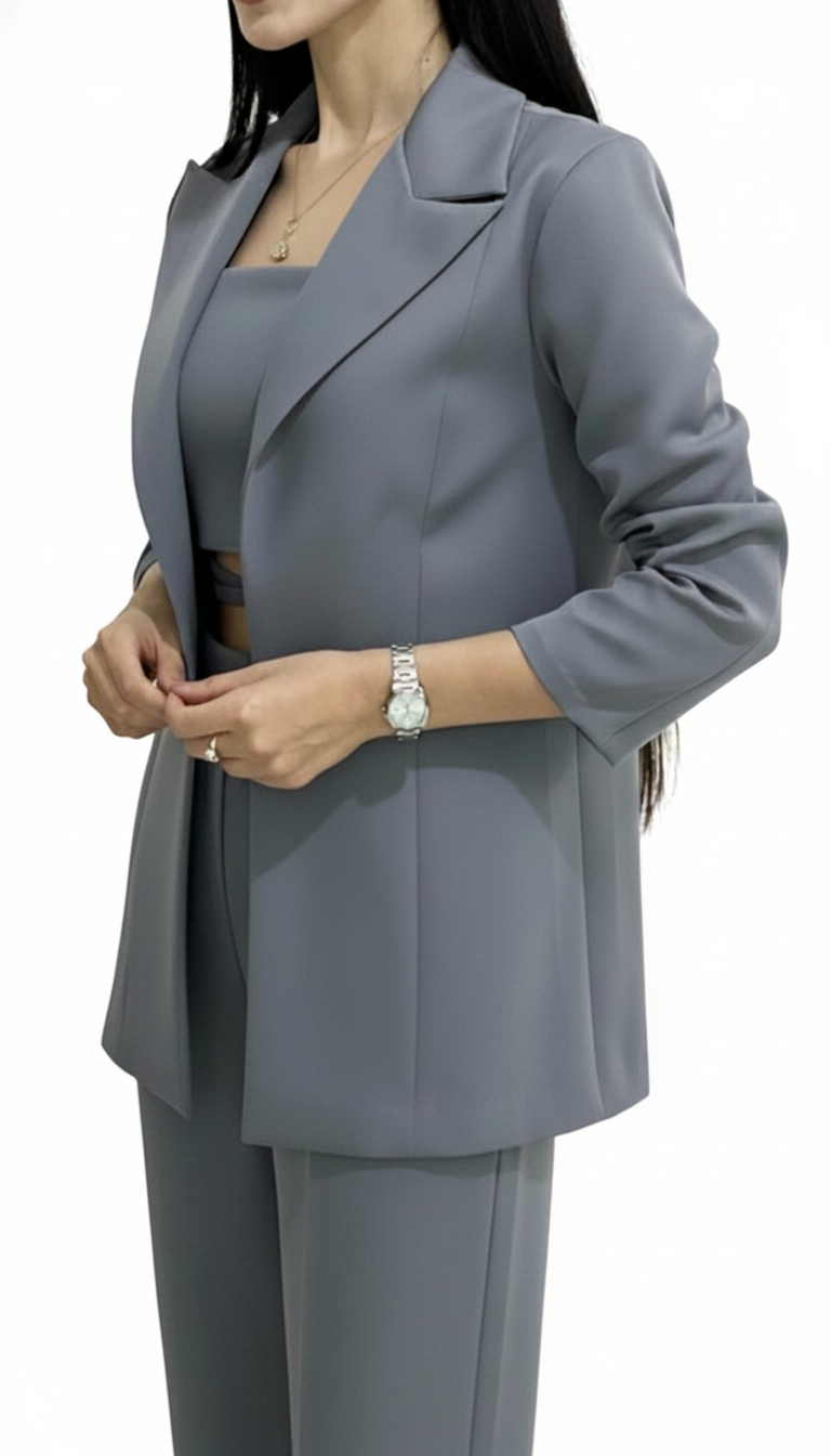 ست سه‌تکه کت و شلوار و کراپ تاپ فشن زیوا کاج رنگ طوسی و از جنس پارچه کرپ مازراتی