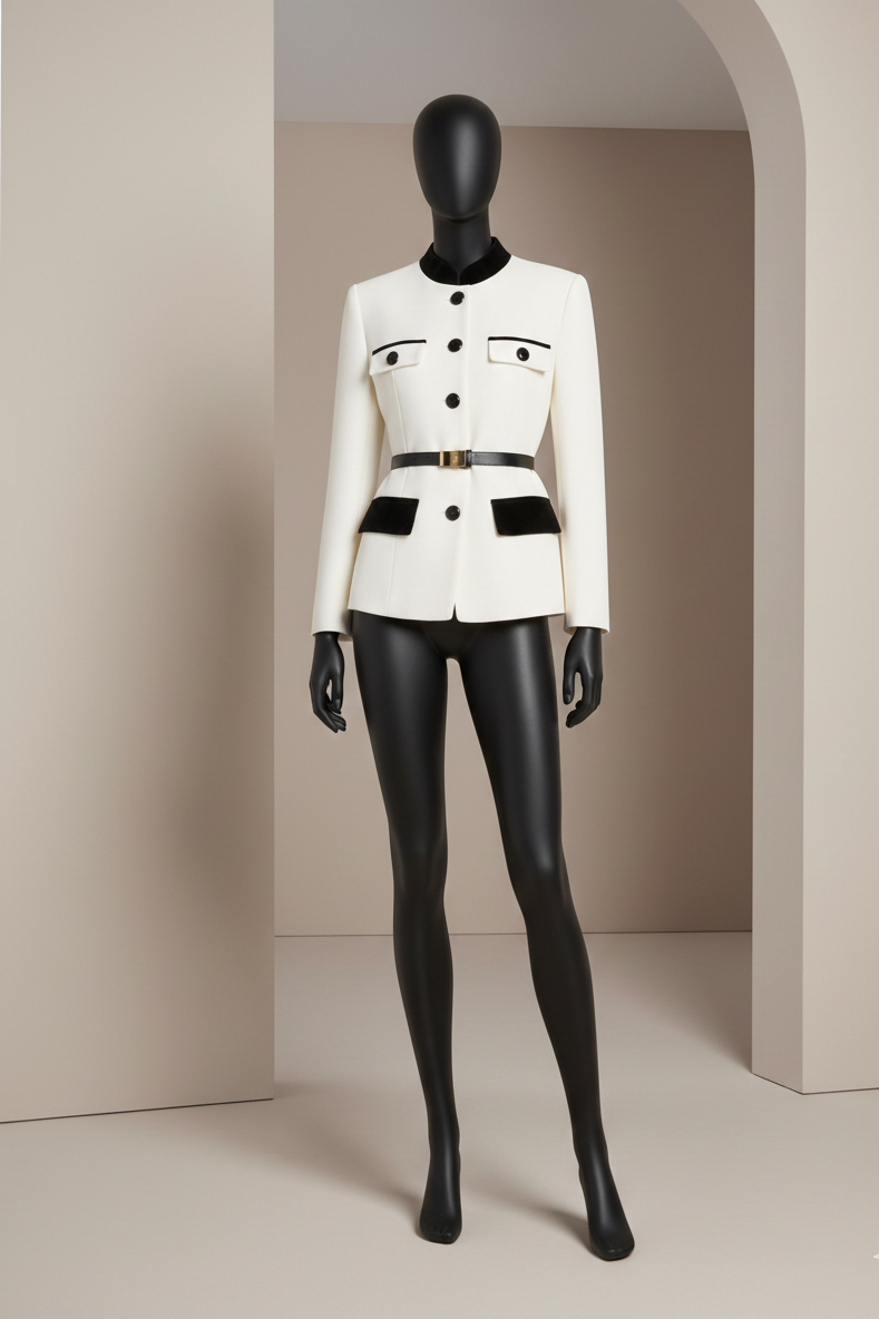 کت کلاسیک "نوبل" ترکیب رنگ سفید و مشکی از جنس کرپ باربی با جزئیات مخمل