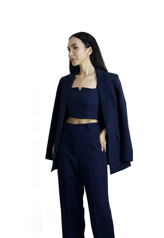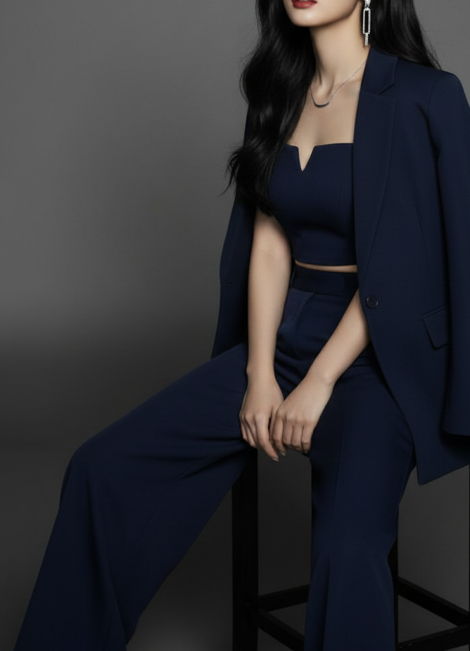 شلوار: مدل راسته (Straight Leg) با کمر بلند و خط اتوی دقیق در جلو. این برش، قد شما را کشیدهتر نشان داده و ظاهر رسمی ست را حفظ میکند.