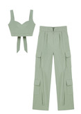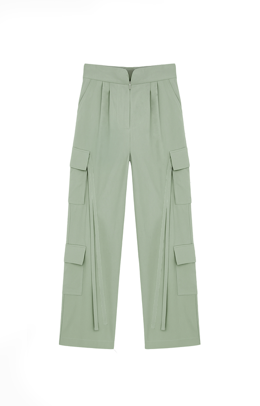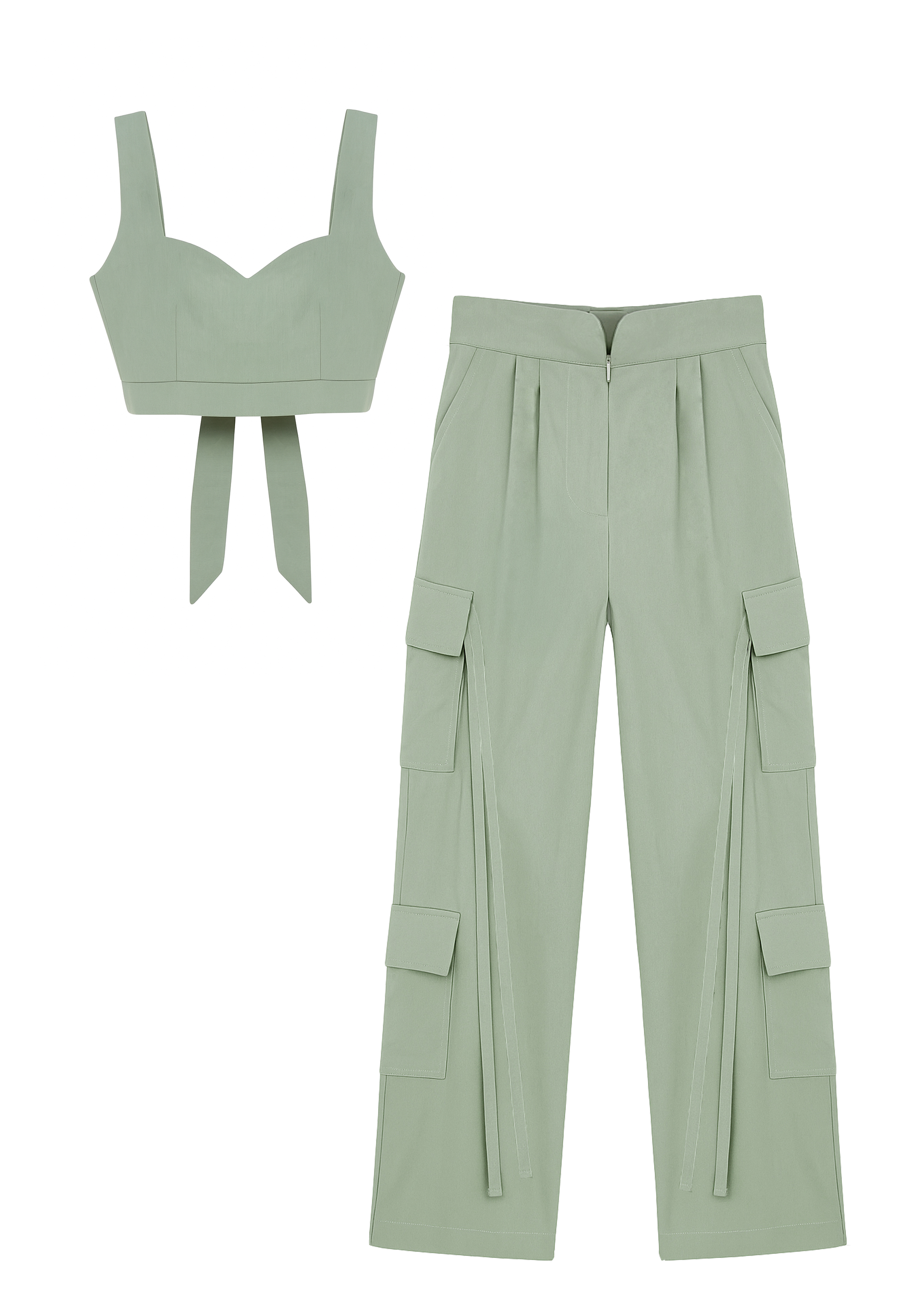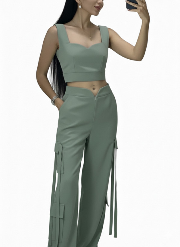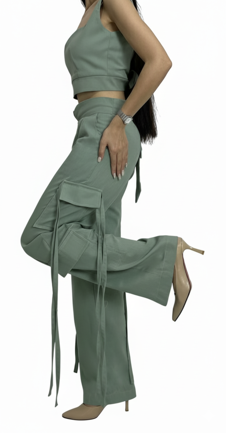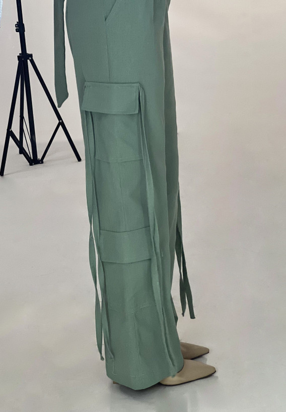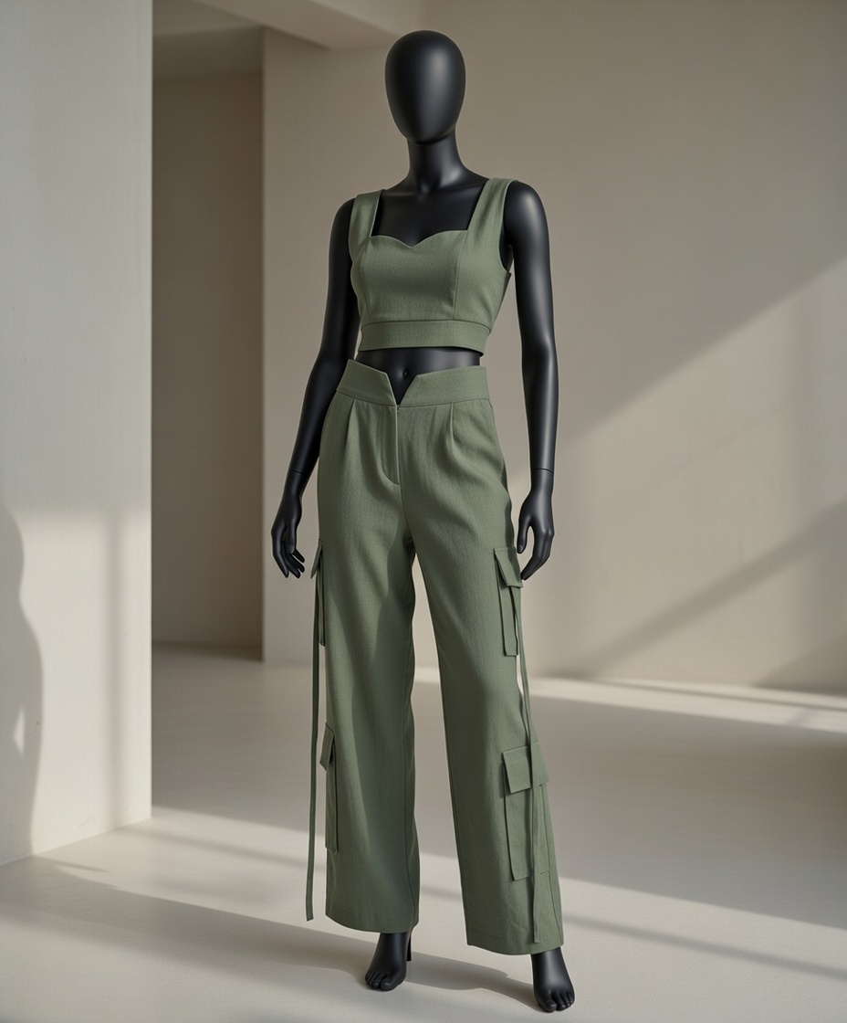 شلوار: مدل کارگو (Cargo) ترندی با جیبهای پاکتی بزرگ در کنار رانها. برش شلوار کمی آزاد و راحت است و با چینهای ظریف در قسمت کمر، ایستایی شیک دارد. بندهای تزئینی عمودی در جلو، استایل خاص شلوار را برجستهتر میکند.