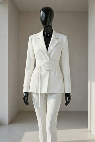 کت سفید مجلسی زنانه با کمربند متصل و قابل جدا شدن ئاوین کاج - جنس کرپ پلاتینیوم
