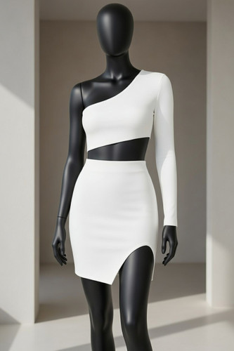 ست دوتکه کراپ تاپ تک آستین و دامن مینی نامتقارن لیانا کاج - جنس کرپ پلاتینیوم
